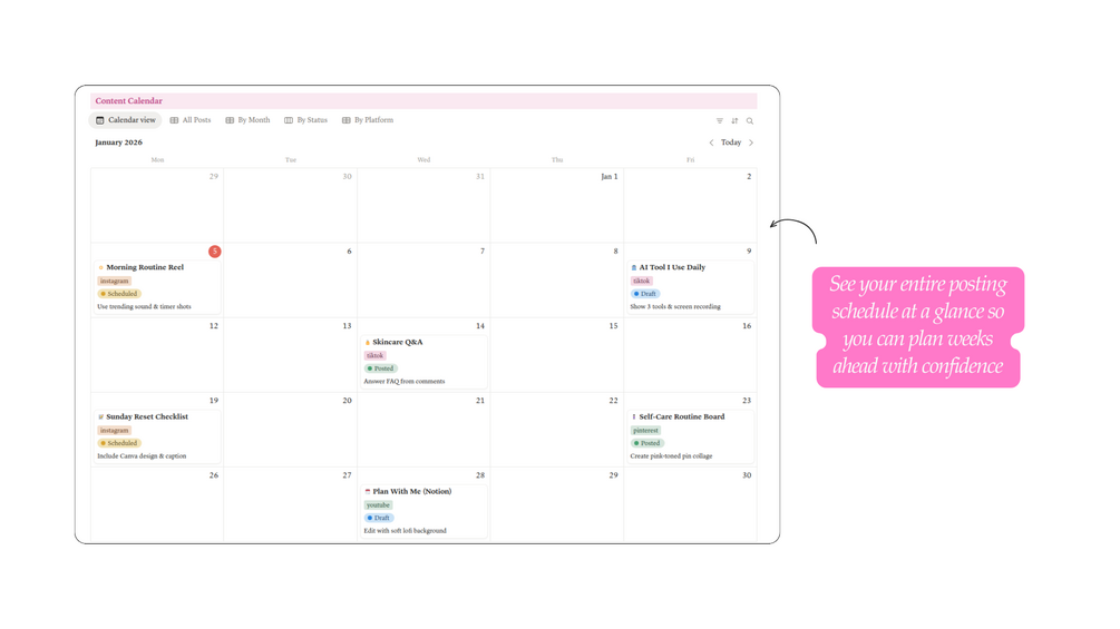 - Built-In Posting Reminders- Get automatic reminders inside Notion so posting never slips through the cracks. Stay accountable without relying on memory or external apps.