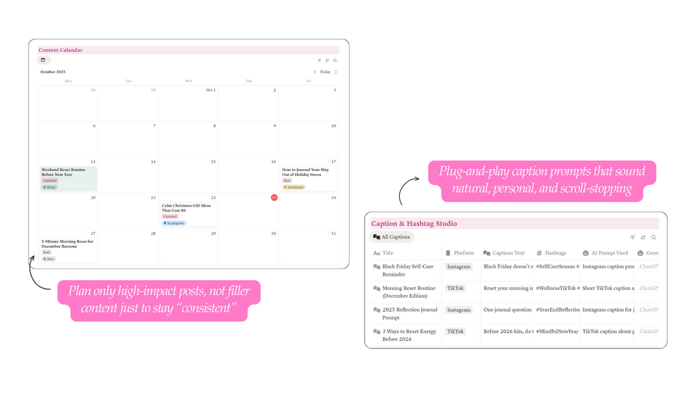 - Caption & Hashtag Library: Write captions faster, and in your voice. Plug-and-play caption prompts that sound natural, personal, and scroll-stopping.