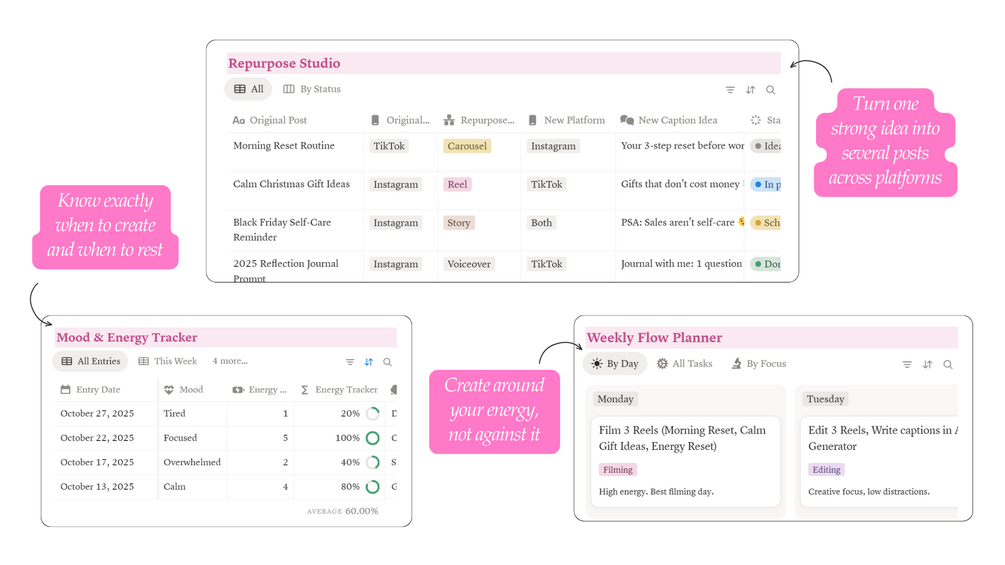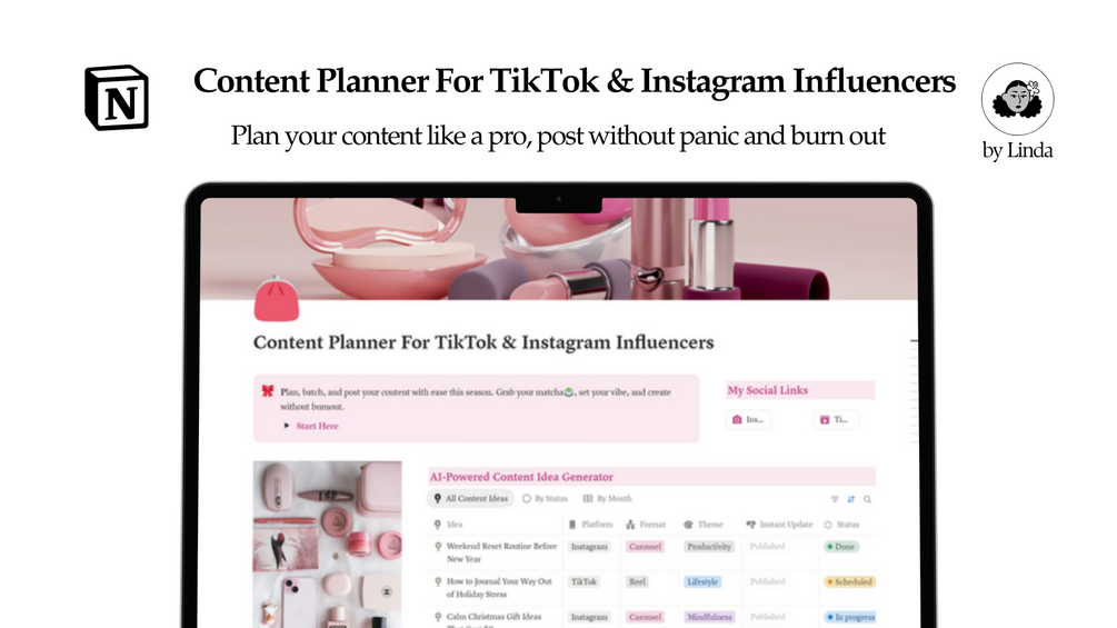 This Content Planner is a Notion system made for Instagram and TikTok influencers who want to post smarter, grow faster, and stop feeling like a content hamster wheel.