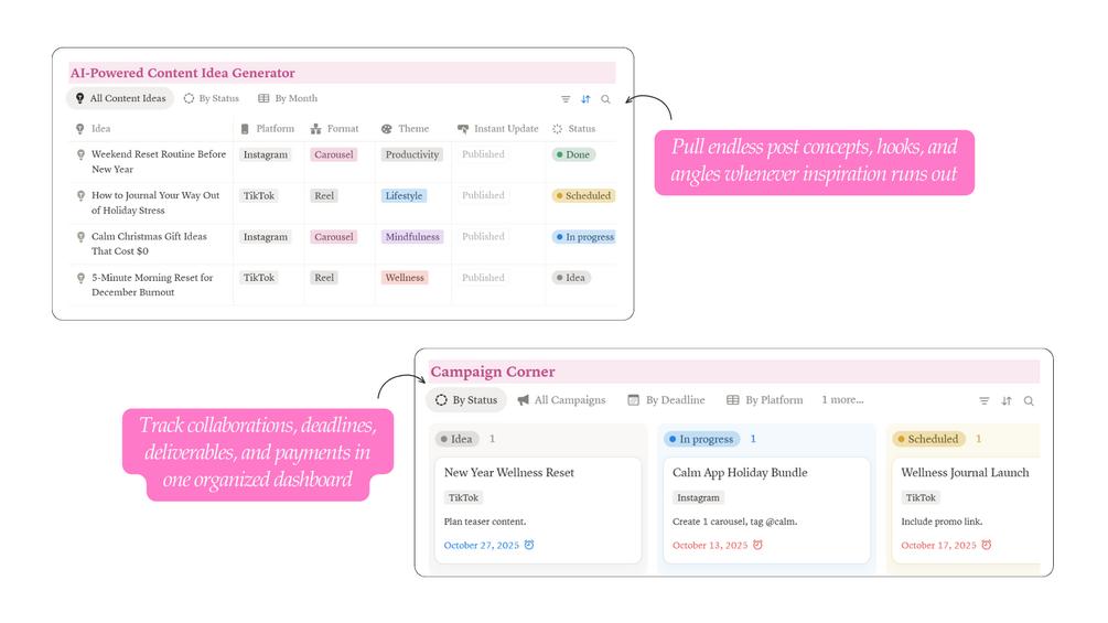- Brand Collab Tracker: Manage brand deals like a pro. Track collaborations, deadlines, deliverables, and payments in one organized dashboard. No missed emails or late posts.