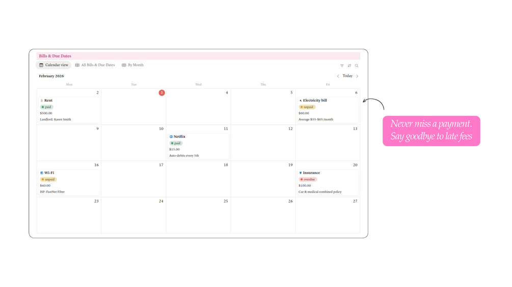 - Smart Reminders- Get gentle nudges inside Notion so all bills are paid on time.