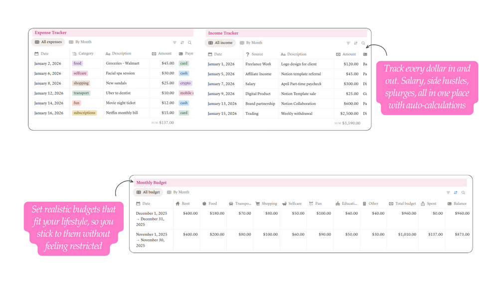 - Monthly Budget Planner- Set realistic budgets that fit your lifestyle, so you stick to them without feeling restricted.