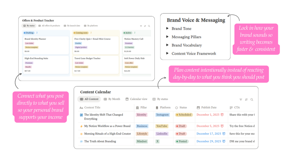 - The Personal Brand OS: The complete, done-for-you Notion workspace with demo content.
