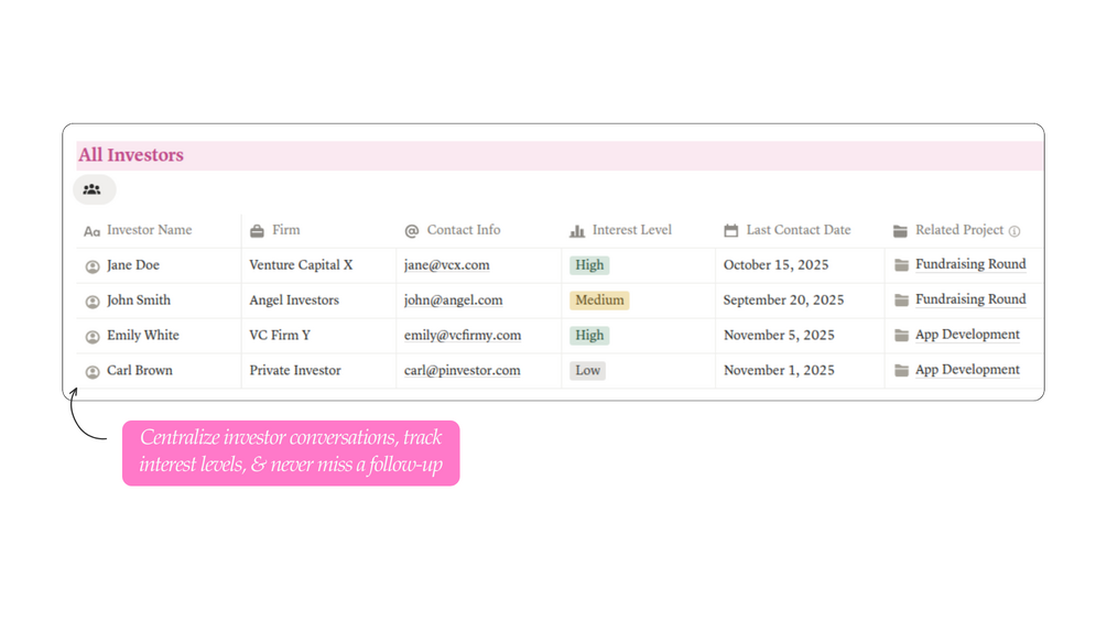 - Investor CRM & Fundraising Pipeline: Centralize investor conversations, track interest levels, and never miss a follow-up. Raise more efficiently by treating fundraising like the critical workflow it is.