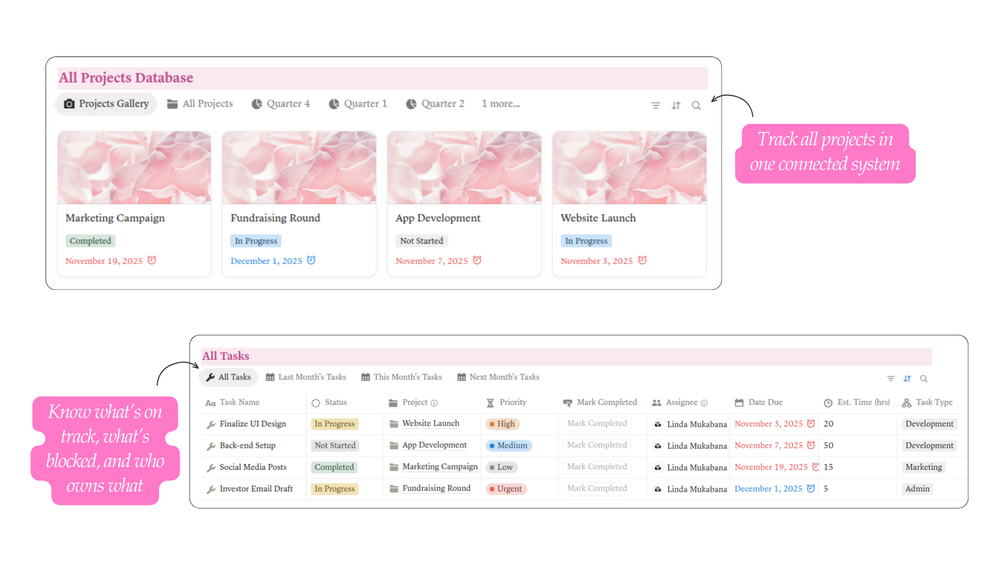 - Fully relational Notion databases: A deeply connected Notion system where data flows automatically across projects, finances, goals, and people. Save hundreds of hours per year and eliminate the errors that kill momentum.