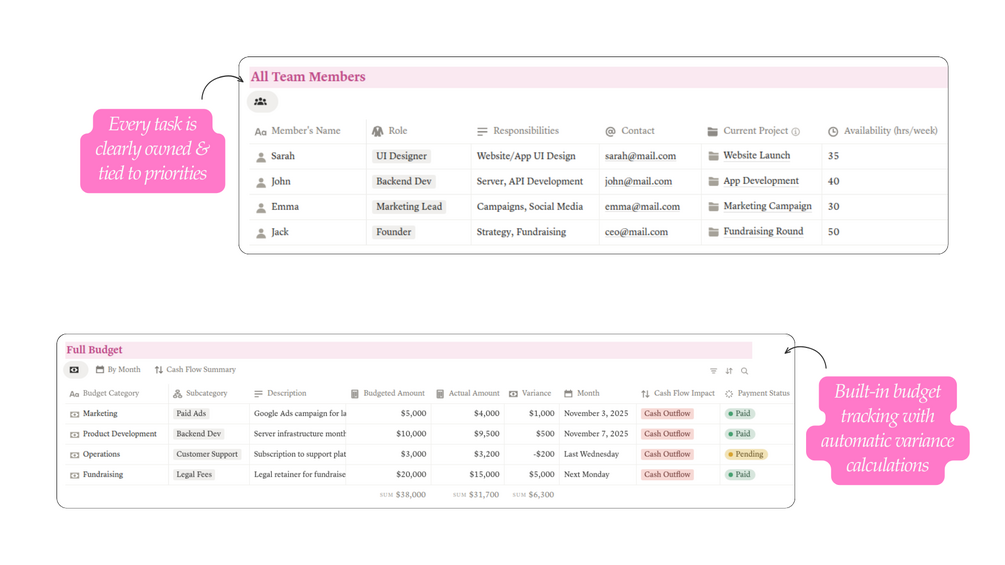 - Real-Time Budget & Financial Tracker: Built-in budget tracking with automatic variance calculations. Catch overspending early and keep your runway visible and under control. Investor-ready numbers, always up to date.