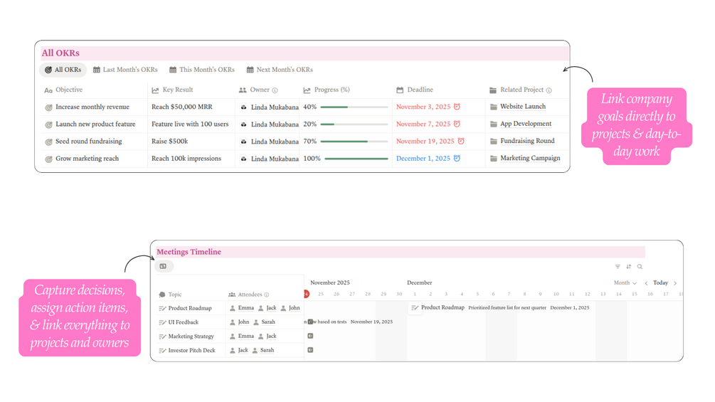- Meeting Notes & Decision Log: Capture decisions, assign action items, and link everything to projects and owners. Nothing falls through the cracks. Every decision stays documented and searchable.